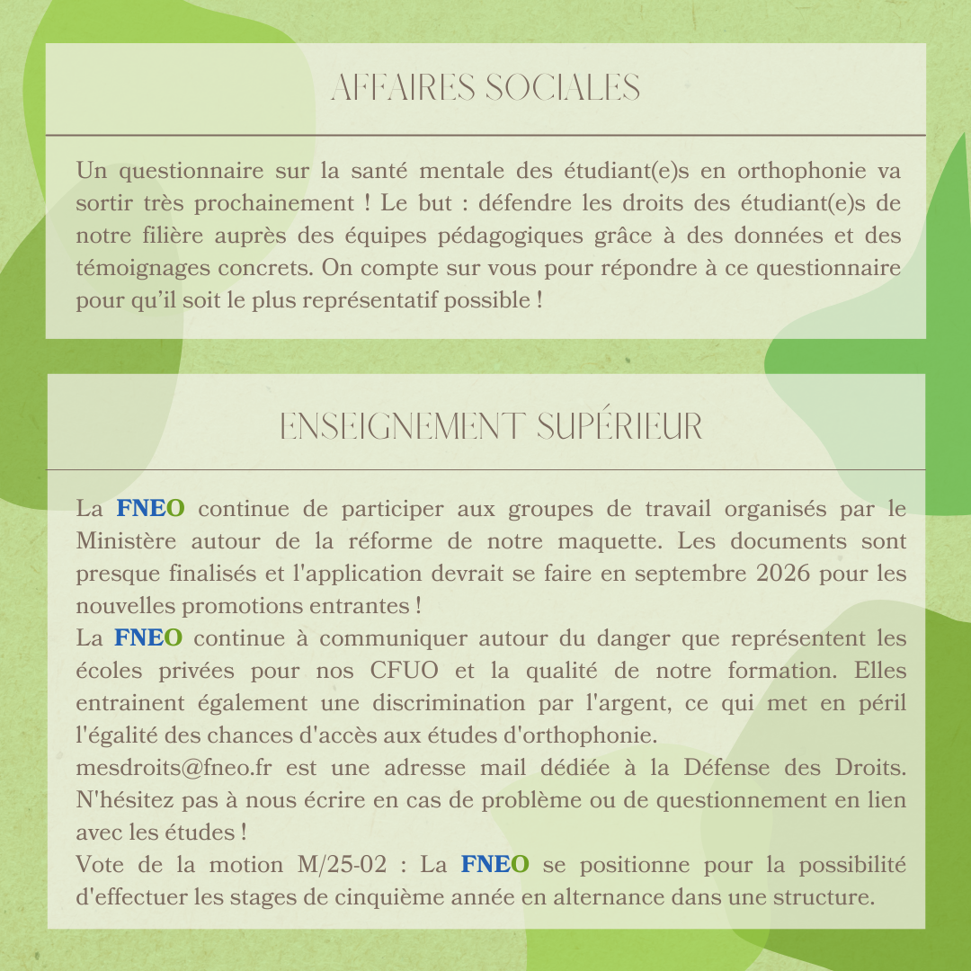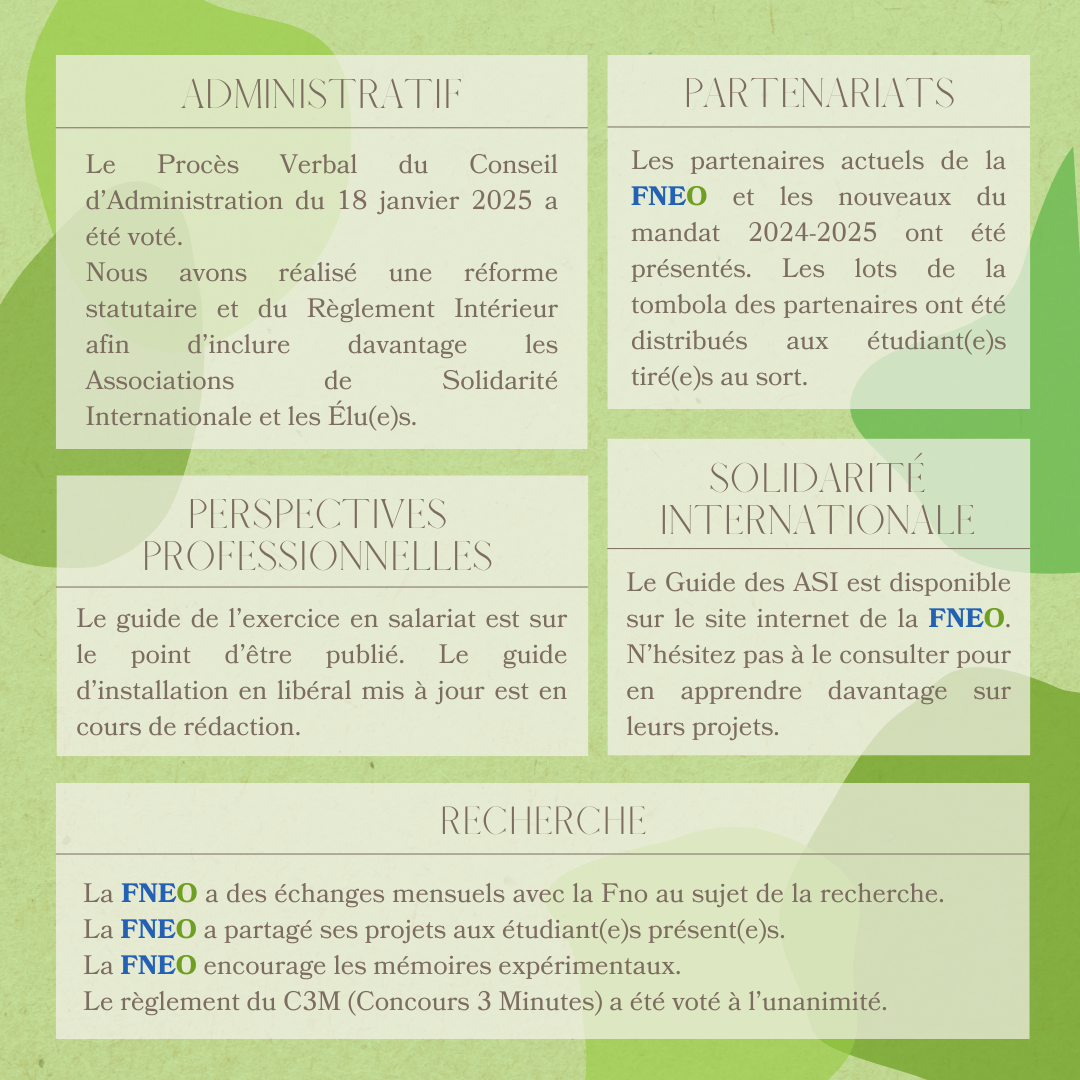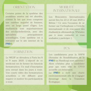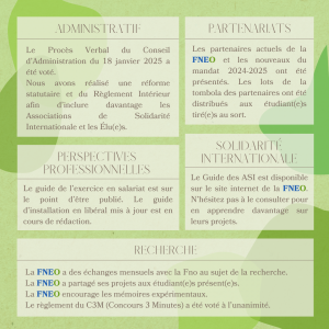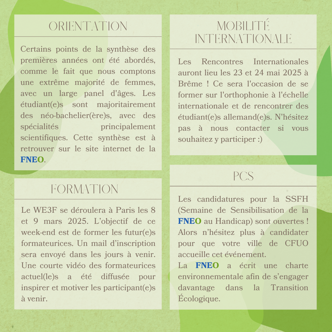 Notre dernière Assemblée Générale (AG) a eu lieu le samedi 8 février lors du Week-End de Formation de la FNEO (WEFF) de Tours. La réforme statutaire et le nouveau Règlement Intérieur ont été votés. Ainsi, l’écriture inclusive est officiellement adoptée jusqu’au nouveau logo de la FNEO 🤩 De plus, les Associations de Solidarité Internationale (ASI) et les élu(e)s peuvent désormais assister à tous les points des Temps Démocratiques ! La nouvelle synthèse des premières années et le guide des ASI sont à retrouver sur notre site internet FNEO.fr. Les étudiant(e)s présent(e)s ont aussi pu assister à des formations en orthophonie et une visite de la ville. Voici le Compte-Rendu de l’AG avec les points essentiels ! ✨